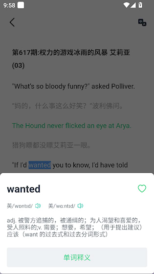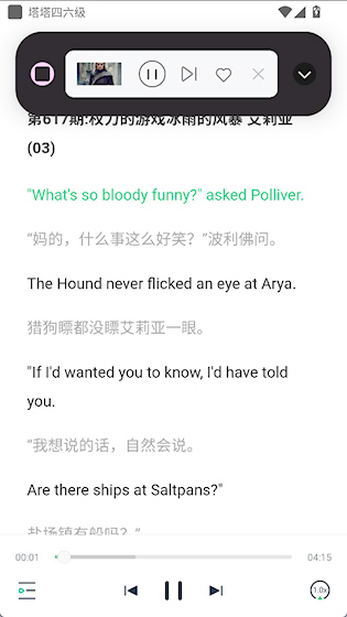 2、打开后会自动播放音频,每一句话都会有中文对照