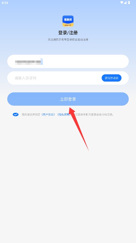2、在登录界面输入手机号和验证码,勾选同意相关协议后点击立即登录按钮完成验证。