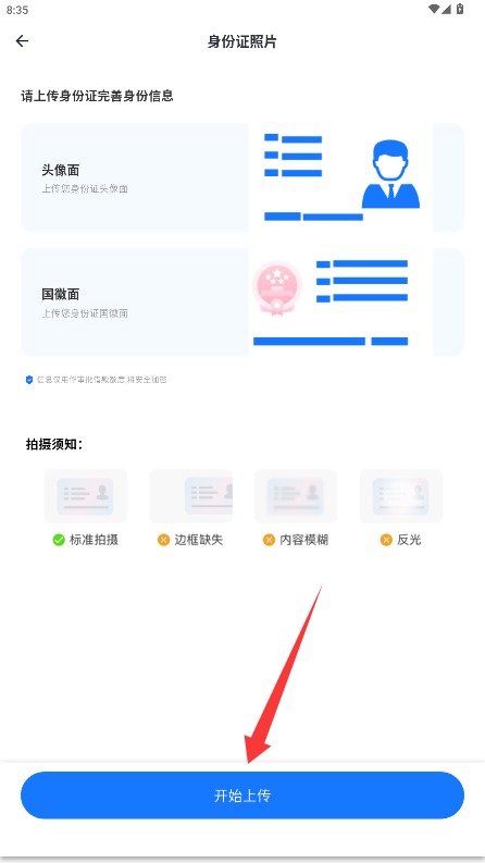 4、按照系统提示要求上传身份证正反面清晰照片,点击提交按钮完成实名认证审核步骤。