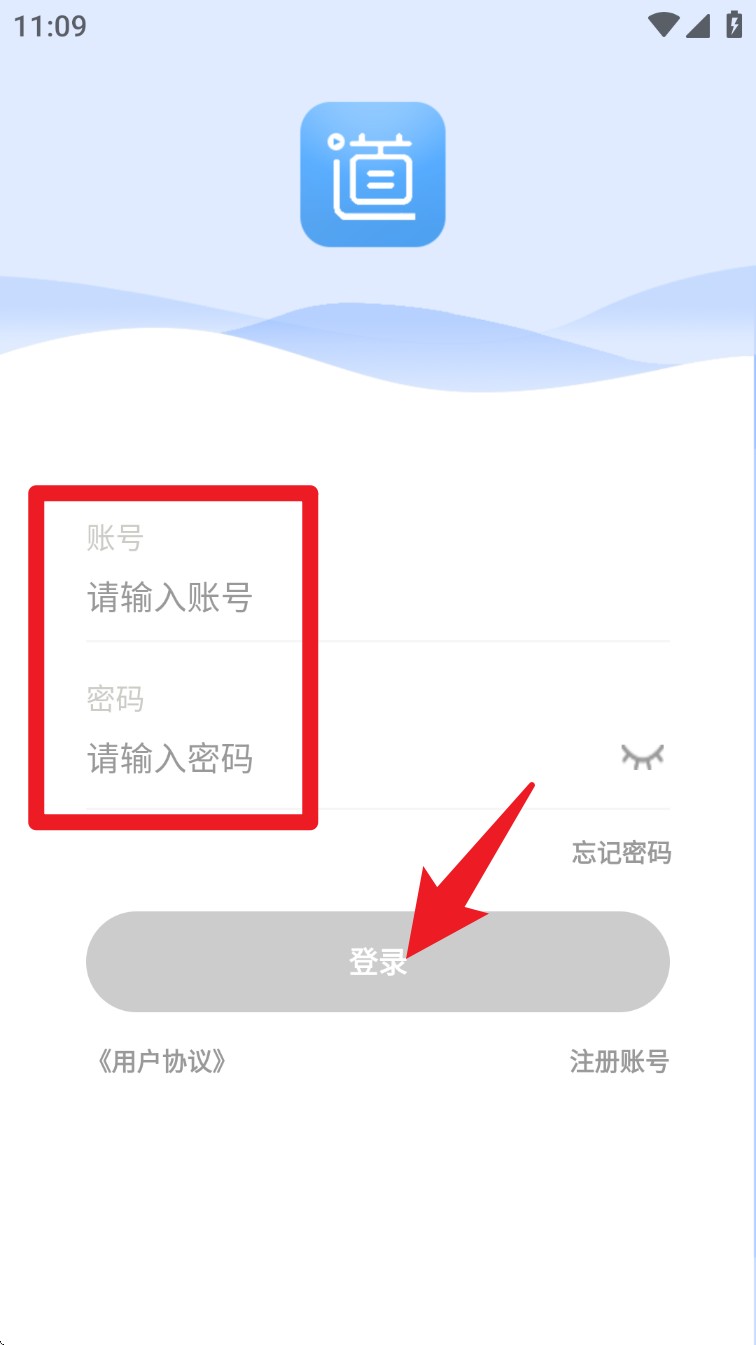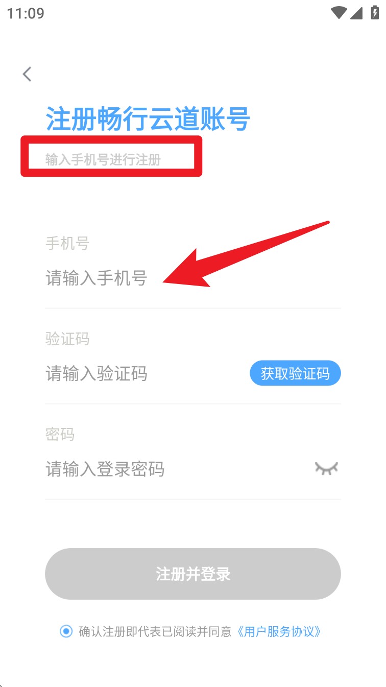 1. 打开App之后,点击注册畅行云道账号,输入手机号、验证码与密码后提交注册。