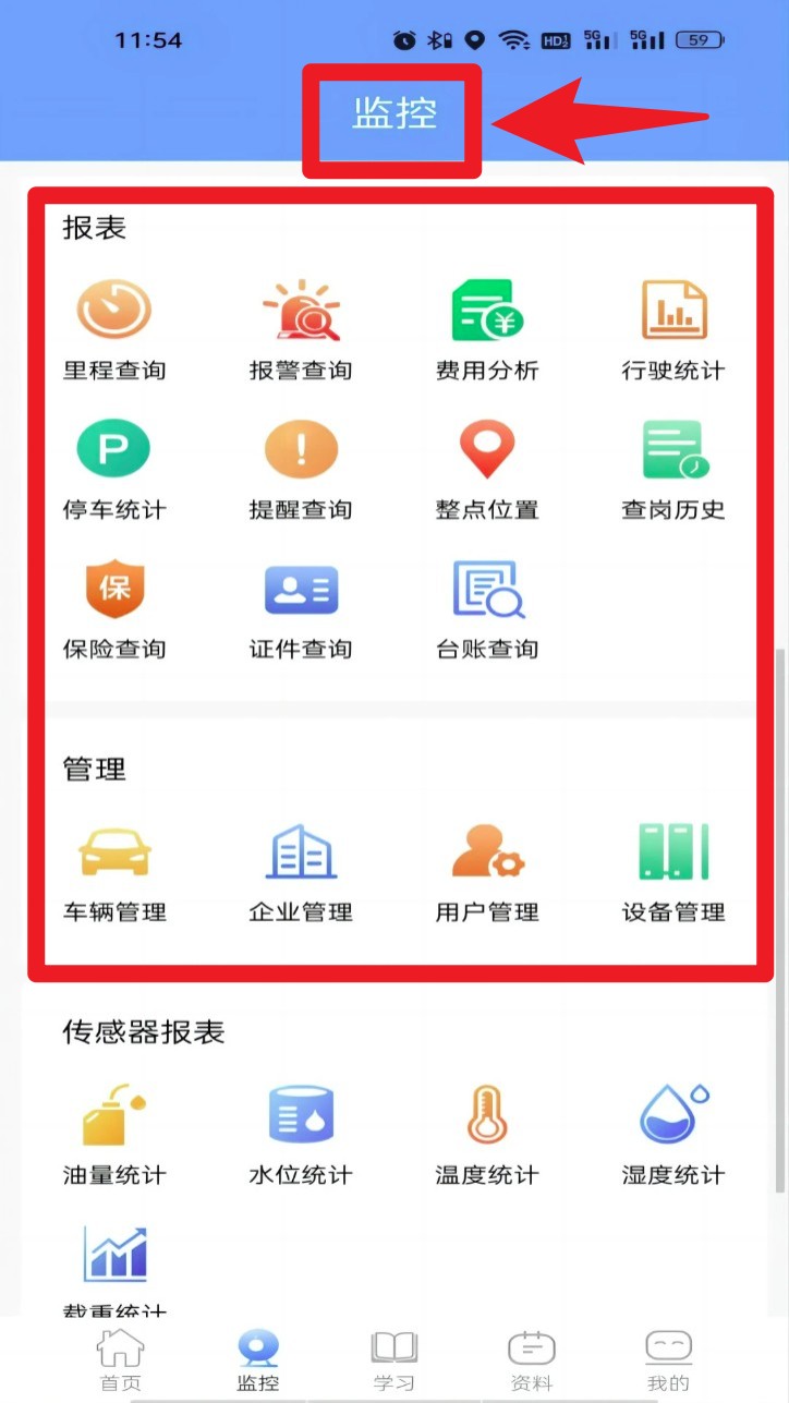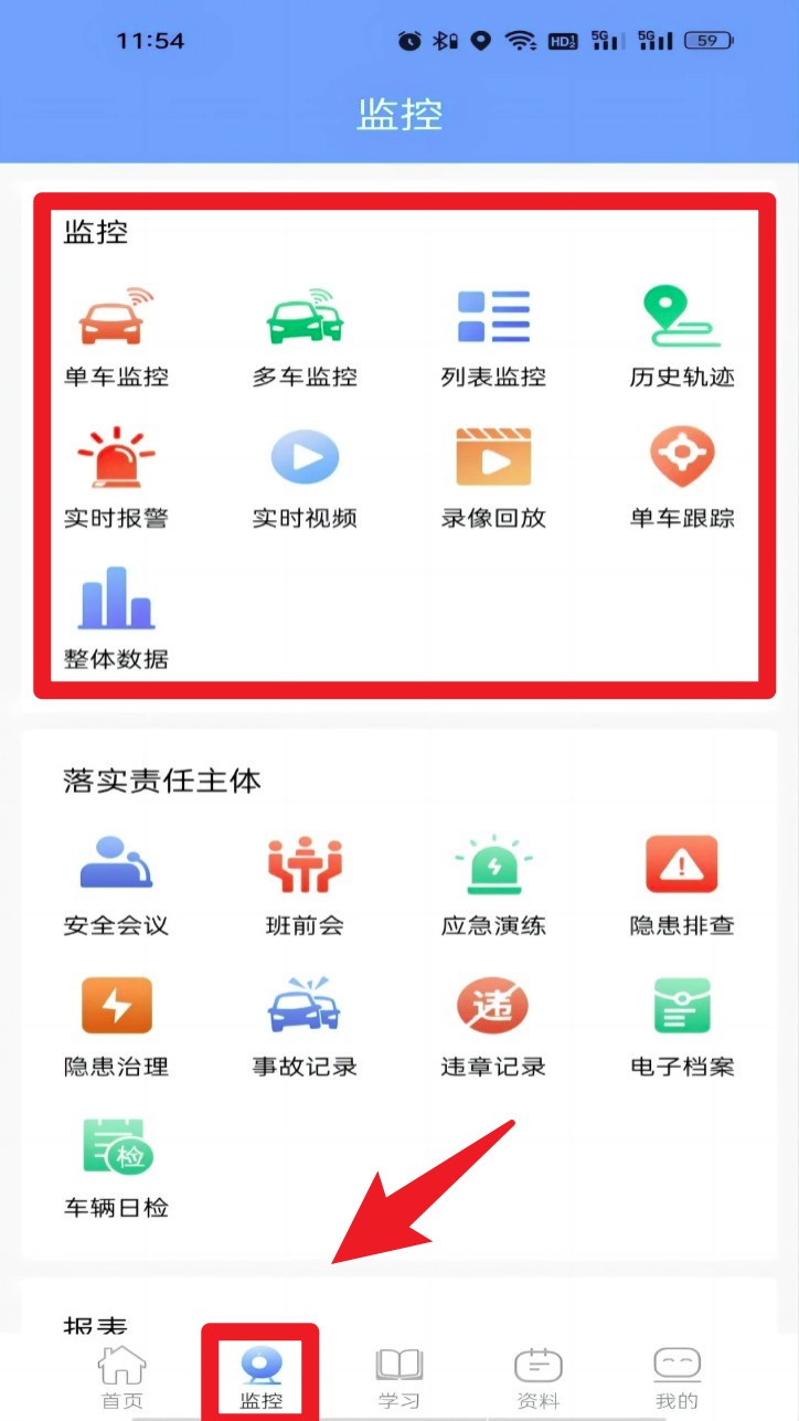 3. 登录后点击底部监控按钮,进入车辆监控板块,可查看实时视频、轨迹回放等信息。