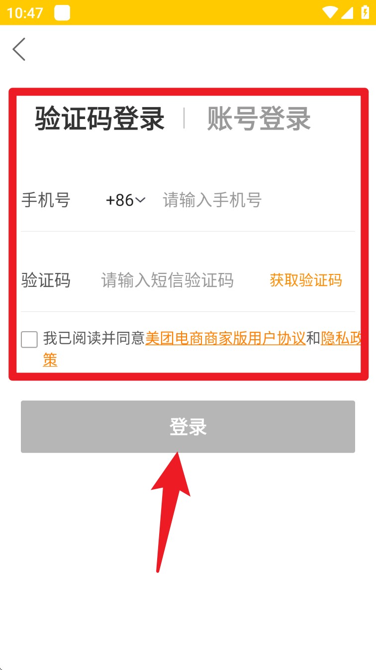 1. 打开App之后,选择验证码登录方式,输入手机号与短信验证码后点击登录。