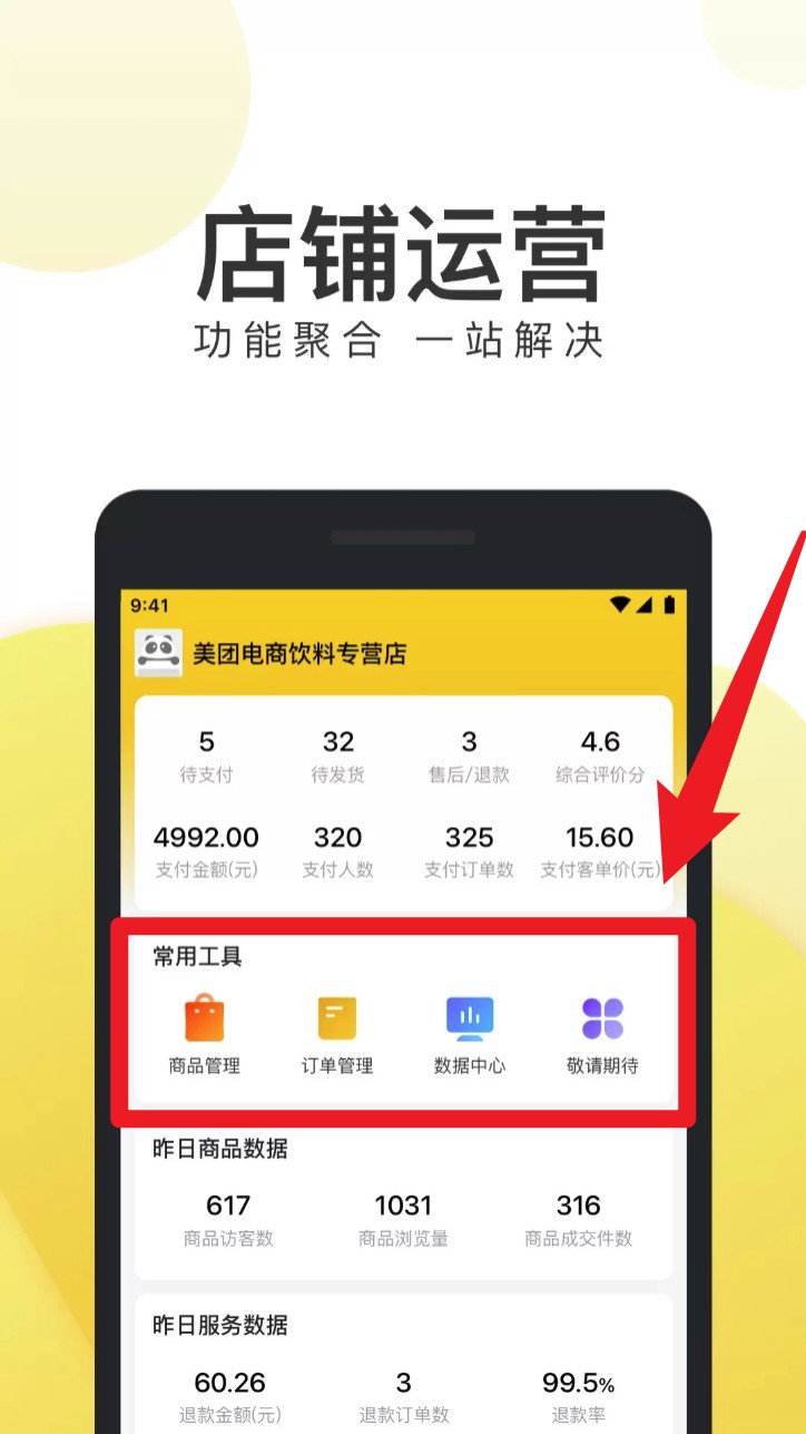 美团电商app是一款专为商家打造的移动端经营管理软件,拥有订单管理、商品管理、店铺运营等核心模块,方便商家随时通过手机掌控门店运营节奏。使用者可以通过手机端轻松查看订单进度、实时监控商品库存状况,立刻处理客户消息,它会支持实时推送业务通知、在线快捷回复,有效的帮助了商家优化工作流程、提升日常服务效率、客户响应速度。