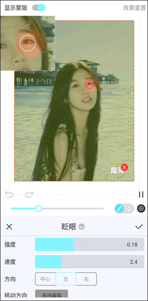 5、以热门眨眼特效为例,调整画笔粗细后,涂抹图片中眼睛区域即可生成效果;