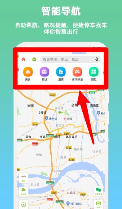 2、智能导航首页整合美食、酒店、商圈、休闲娱乐等地点搜索入口,支持智慧出行路径规划。