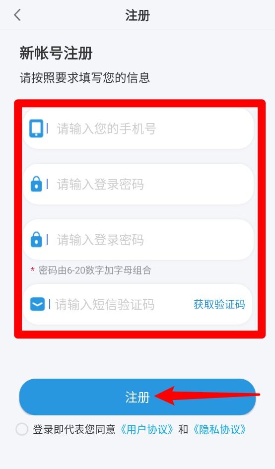 1、注册界面需填写手机号、密码和短信验证码,点击注册按钮即可创建新账号,操作简单快捷。