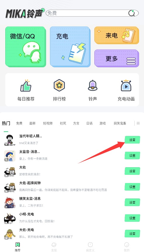 2、进入推荐频道浏览精选铃声,点击心仪的铃声后选择右下角设置按钮。