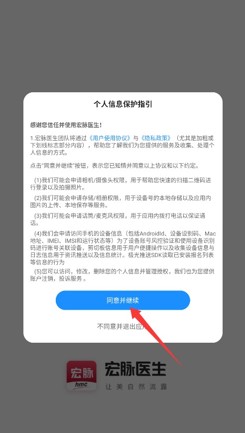 1、启动APP之后,阅读并同意用户协议与隐私政策后,点击同意并继续进入登录界面。
