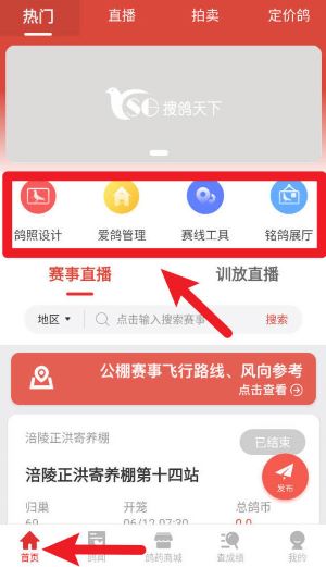 2、点击首页的功能图标区,可进入鸽照设计、赛线工具、赛事直播等功能模块,轻松完成日常鸽务操作。