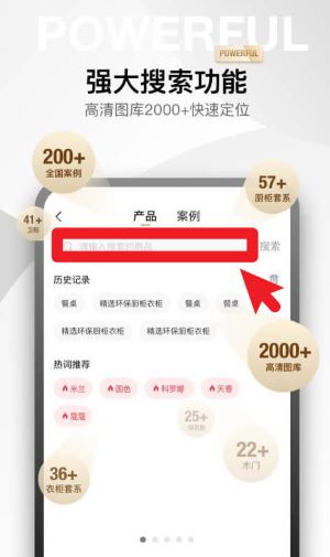 1、在首页点击搜索栏输入关键词,系统会从2000+高清图库中快速匹配相关产品与案例内容。