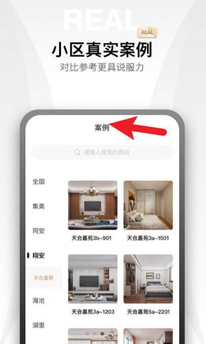 2、进入案例页面后选择对应小区名称,即可查看实景装修案例,更方便参考真实场景。