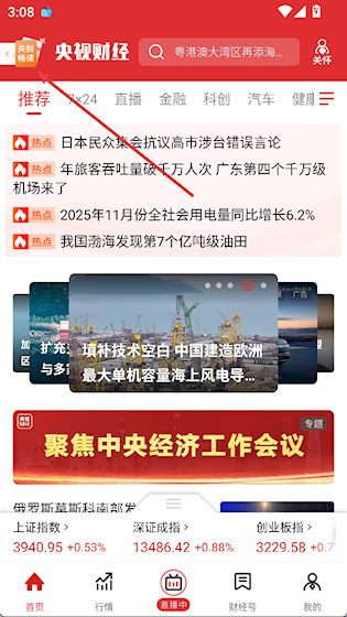 1、打开央视财经app,点击左上角的“央视畅读”