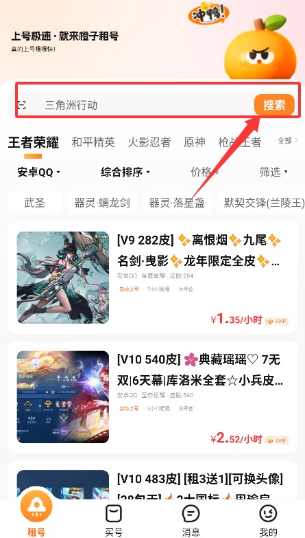 1、打开应用后选择租赁服务,在搜索框内输入想玩的游戏名称,系统会显示可租账号列表。