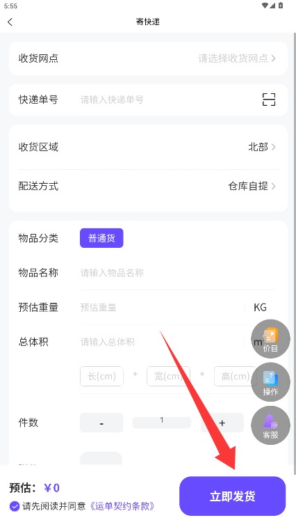 1、寄件操作流程:选择寄件类型并填写货物详情,系统智能计算运费金额。完成支付后预约上门取件或安排自行投递。