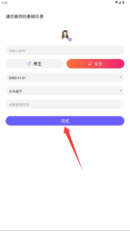 3、按要求设置个人昵称和基础信息及登录密码,完善基本信息后提交完成资料填写。