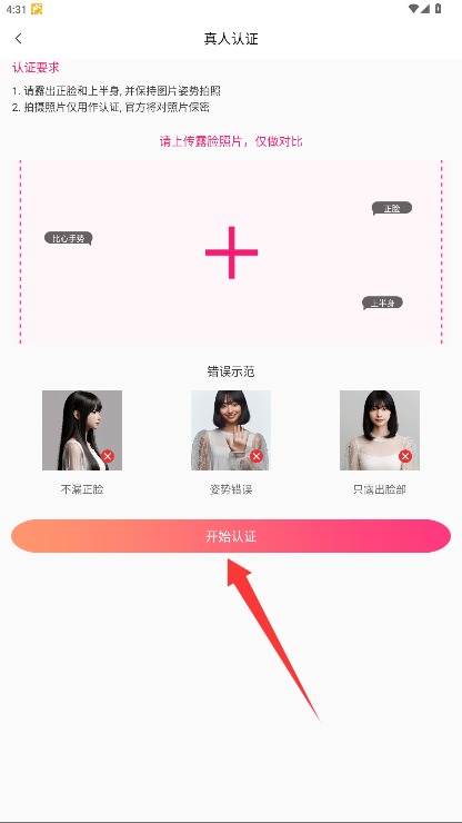 4、根据系统提示进行真人认证,可选择上传或拍摄本人照片通过审核即可使用。