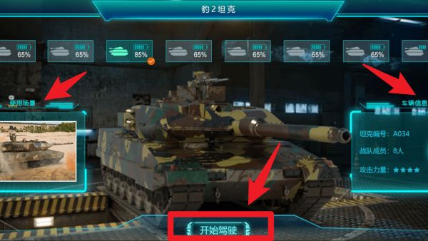 2、进入主界面后可选择坦克型号、查看车辆信息与使用场景,确认后点击底部开始驾驶按钮即可进入模拟操作。