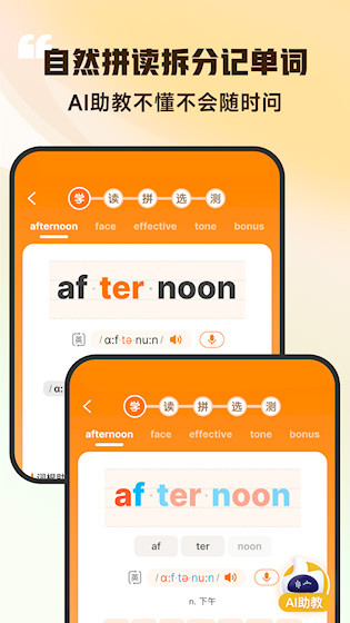 2、自然拼读与词根拆分:每个单词提供音节划分、自然拼读规则及词根词缀解析,从多个角度辅助理解和记忆,降低背诵难度。