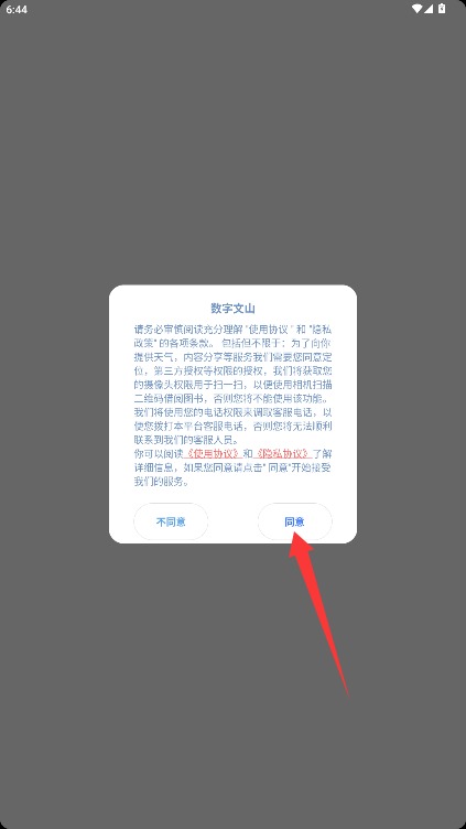 1、初次使用需阅读用户服务协议与隐私政策,确认后点击同意选项进入应用。