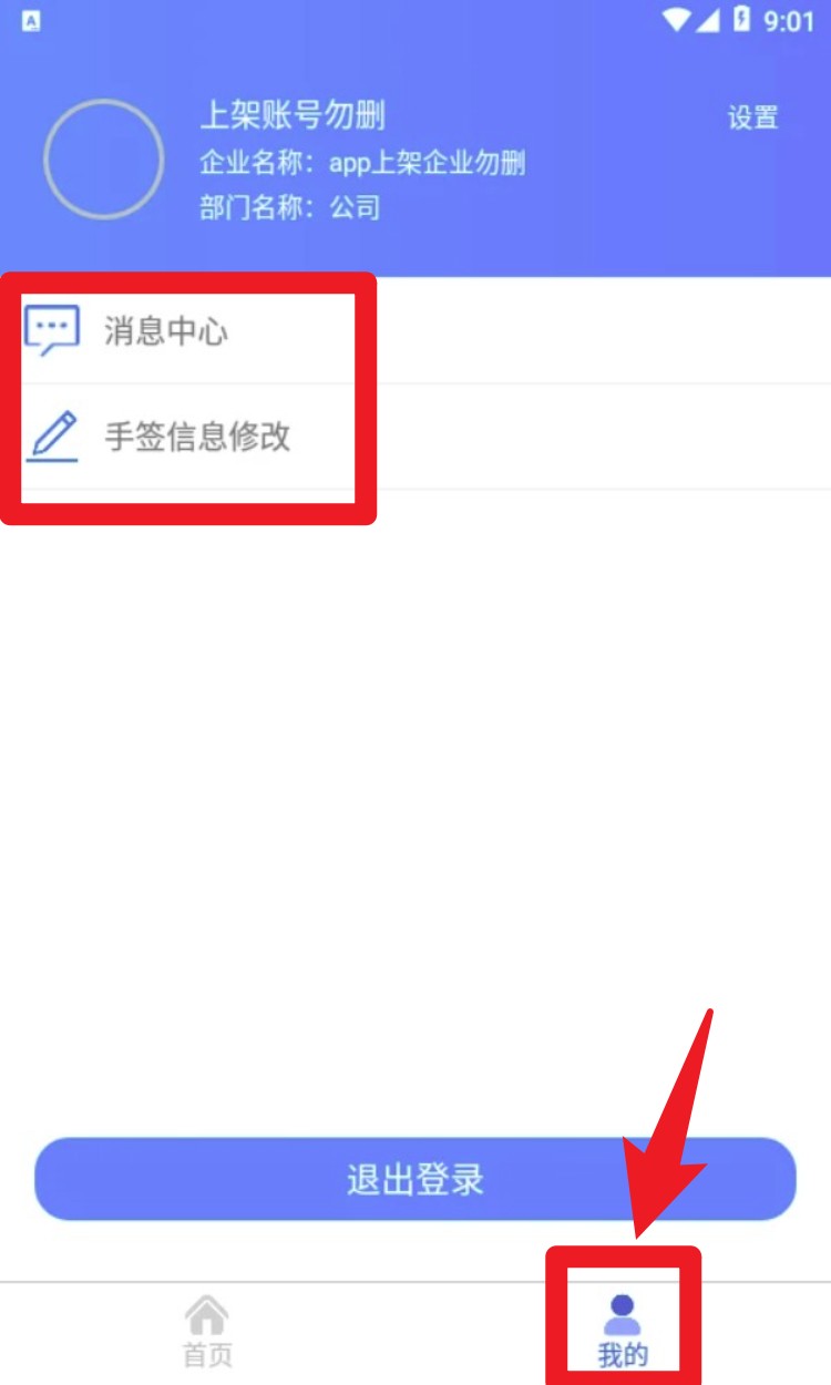 5. 点击下方我的标签页,进入个人信息页面,可查看绑定企业资料与部门,并修改签名信息或退出登录。