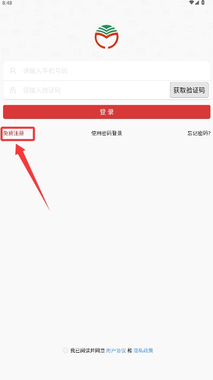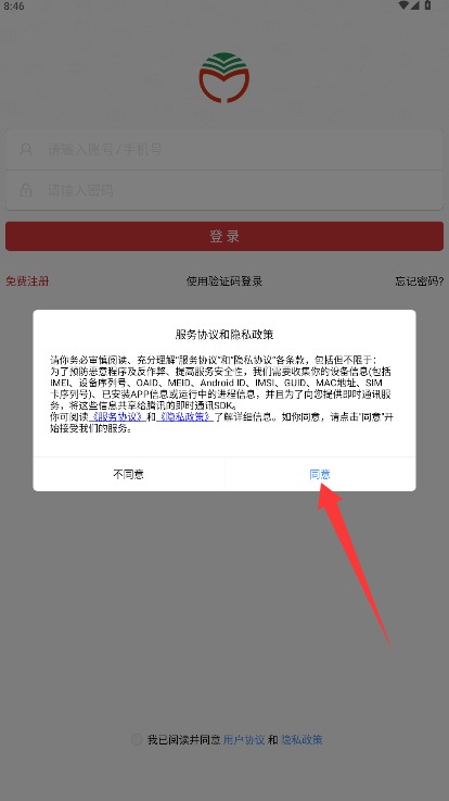 1、初次使用需阅读平台服务条款与隐私政策,确认后点击同意选项进入注册界面。