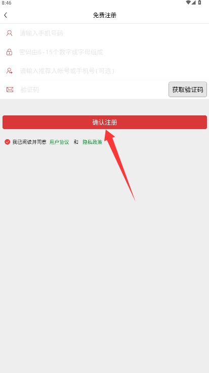 3、按要求输入手机号码及密码,输入验证码并勾选同意用户协议后点击确认注册。