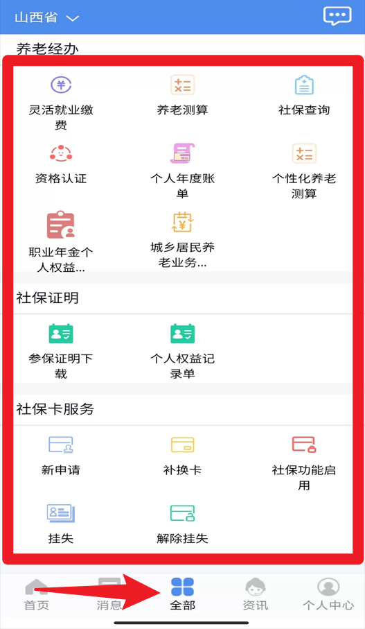 2、在全部页面,分类展示了养老经办、社保证明和社保卡服务,用户可直接办理新申请、补换卡或挂失操作。