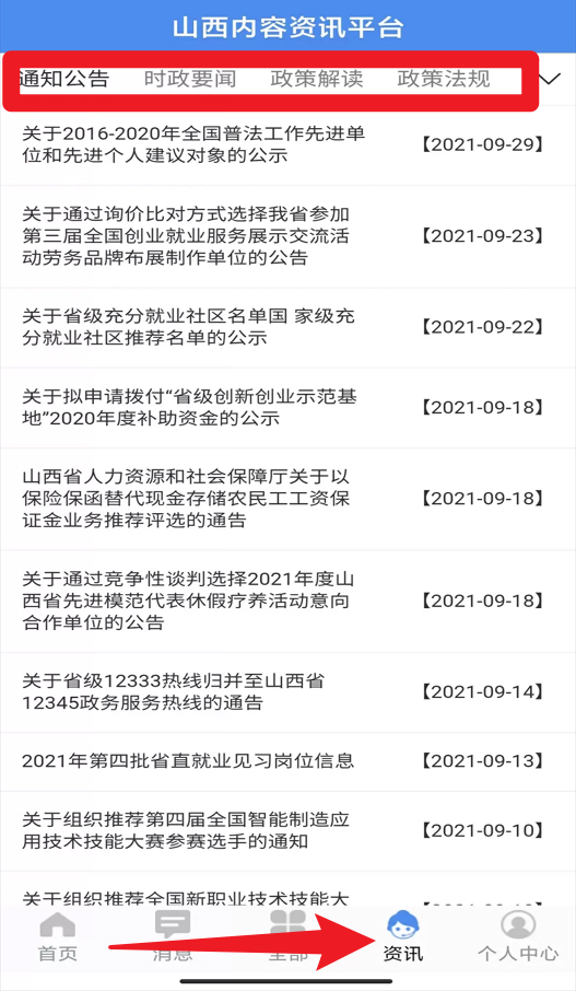 3、选择资讯模块,即可查看山西省内的通知公告、政策解读及法规文件,确保获取权威且最新的社保资讯。