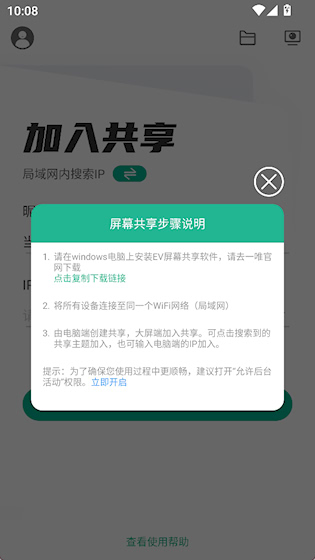 EV屏幕共享是一款投屏工具,在局域网环境下实现手机与电脑、大屏设备之间的低延迟画面同步,采用无线连接方式,无需数据线即可一键投屏,适用于会议演示、教学展示等多种场景,支持高清画质传输,适合对延迟和画质有较高要求的使用环境。