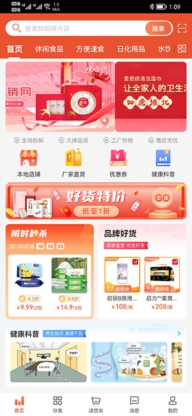 1、下载安装娃哈哈快销网app,打开进入软件首页,可查看限时秒杀板块内家庭好物折扣信息、品牌正品上新内容,众多品牌已入驻平台;