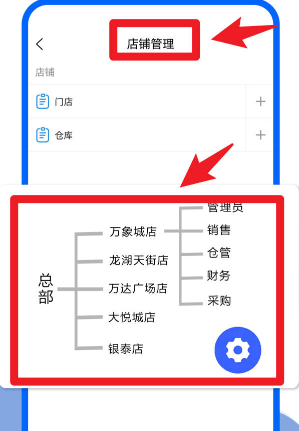 2、在店铺管理界面,用户可以清晰查看总部及旗下各分店的组织结构,每个门店都能细分至管理员、销售、仓管等岗位,方便高效地进行分工管理与职责分配。