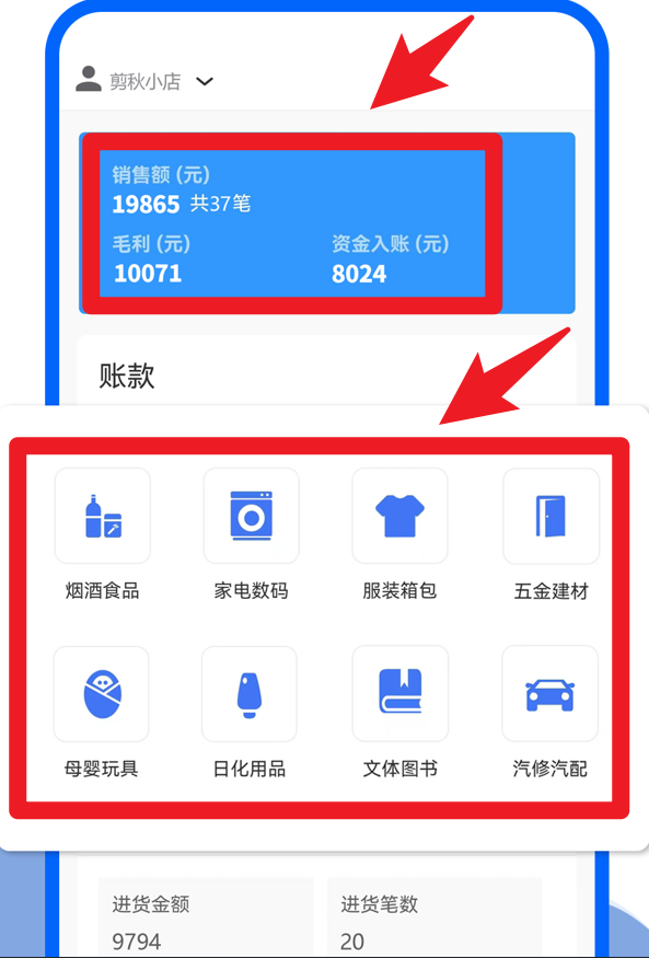 3、画面展示销售额、毛利及入账金额,用户还能按商品类别查看销售情况,随时掌握经营动态与盈利状况。