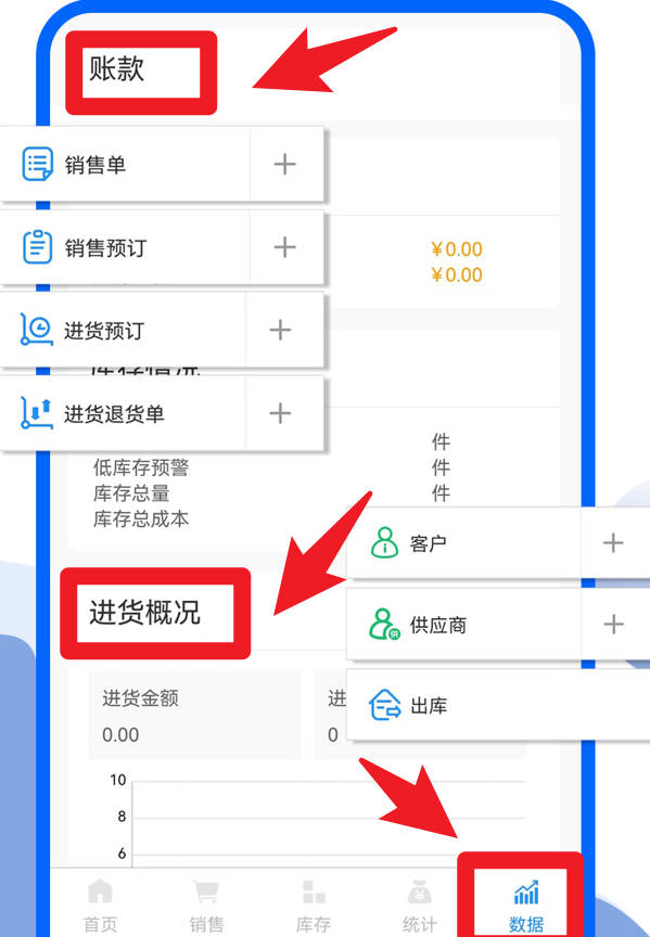 4、在数据统计板块,可查看账款、进货概况及客户与供应商资料,帮助商家实时掌握库存与资金流向。