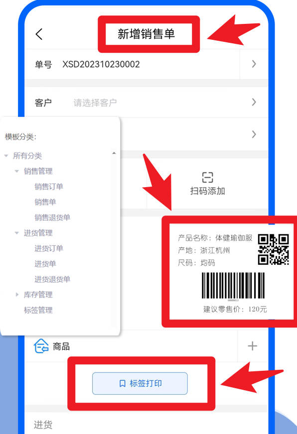 5、创建销售单时,系统可自动生成条码与价格,并支持标签打印,提高进销存管理效率。