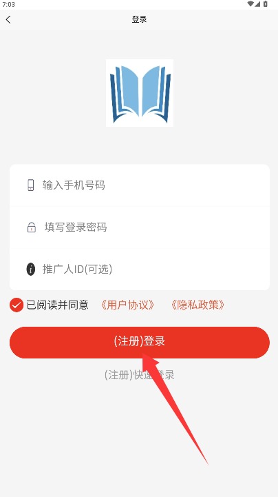 2、在登录页面输入手机号和登录密码,勾选同意相关条款后点击注册登录按钮进入。