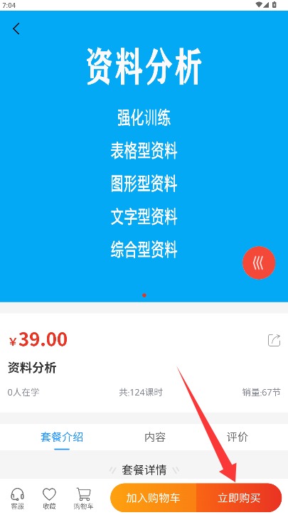 4、进入套餐详情页面了解具体内容,确认后点击立即购买按钮完成课程选购。