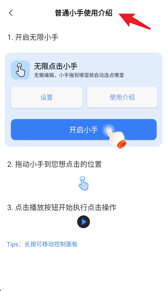 2、点击使用介绍了解普通小手操作步骤,依次完成开启、拖动及播放执行即可完成设置。