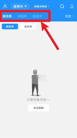 2、在任务中心界面可查看新任务、待取单和配送中状态,便于骑手实时掌握接单与配送进度。