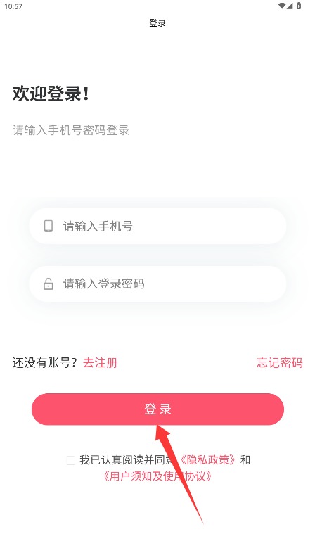 2、在登录页面填写手机号与登录密码,勾选同意相关条款后点击登录按钮完成验证。