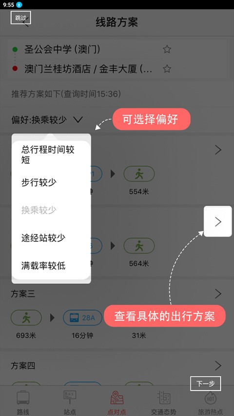 5、在“点对点”页面的线路方案中,可选择出行偏好并查看具体出行方案;