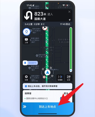 5、导航模式下显示路线详情,到达指定上车点后点击到达上车地点。