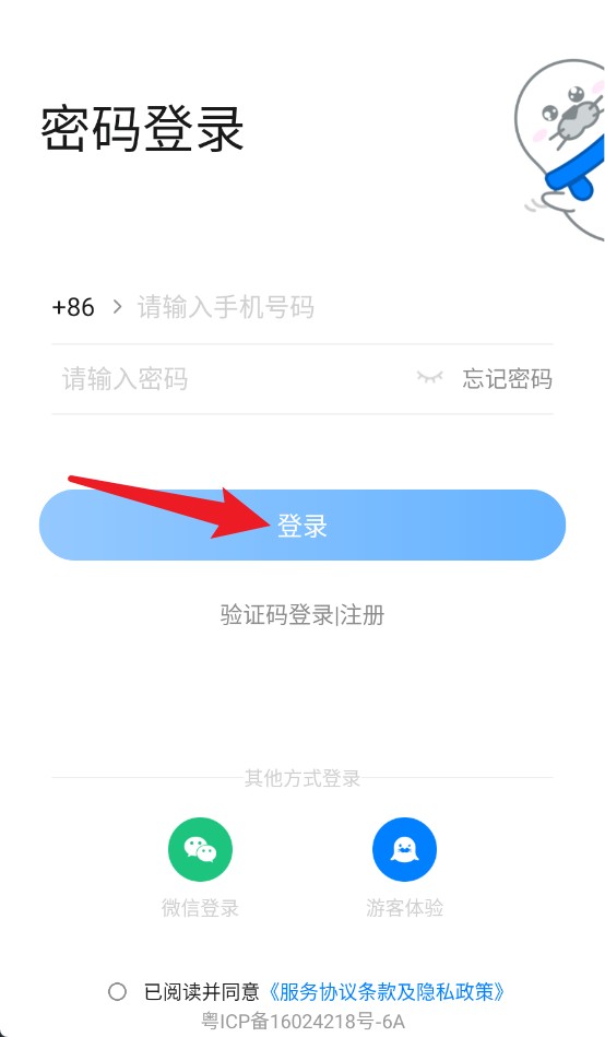 1、在登录页面输入手机号与密码后,点击蓝色登录按钮即可进入应用主界面操作。