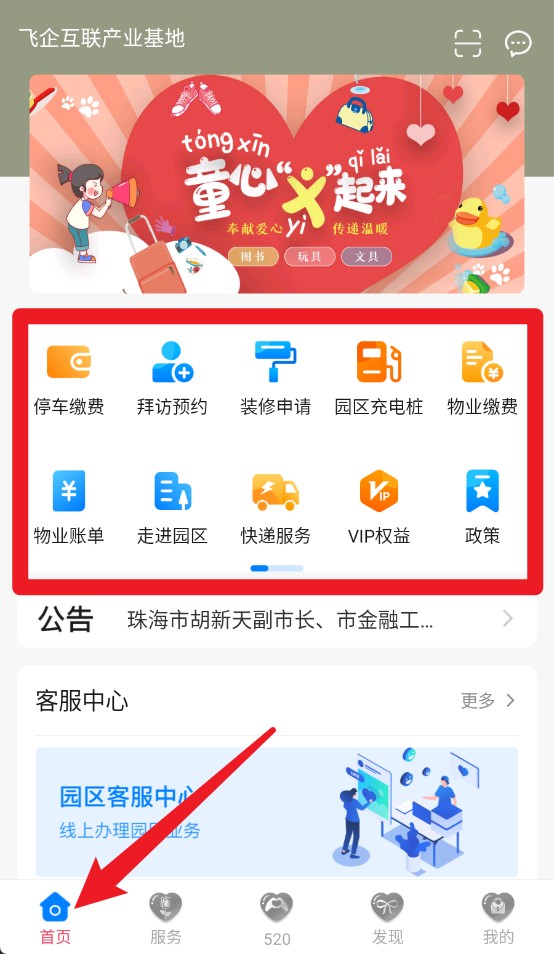 2、点击底部首页标签后,可快速进入园区服务主页,查看各类功能入口选项卡。