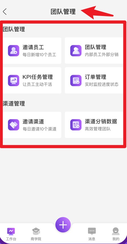 4、在团队管理中可邀请员工、管理团队、分配订单及查看渠道销售数据。