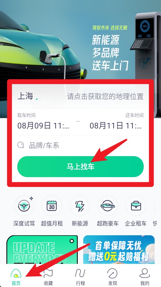 2、首页找车功能:在首页输入相关信息,点击“马上找车”开始搜索可用车辆。