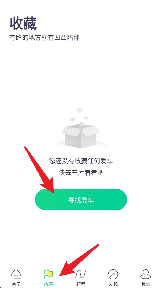 2、在收藏页面查看已收藏的车辆,若暂无内容可通过寻找爱车跳转至车库挑选。
