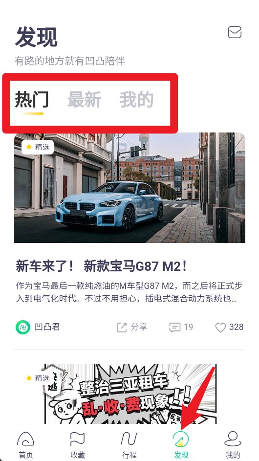 3、发现页展示热门内容、新车资讯与个人发布,轻松获取最新车型与租车动态。
