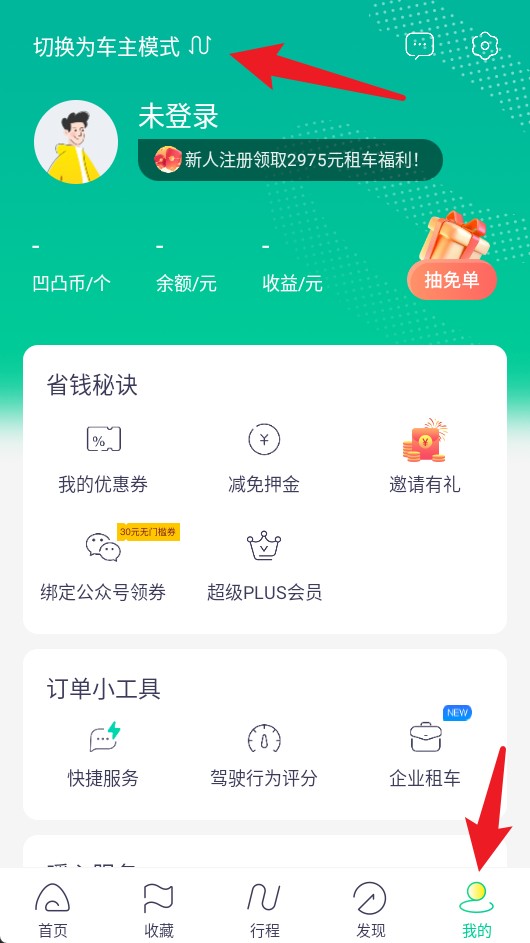 4、点击我的可查看账户信息、优惠券、收益及邀请奖励,支持切换为车主模式。