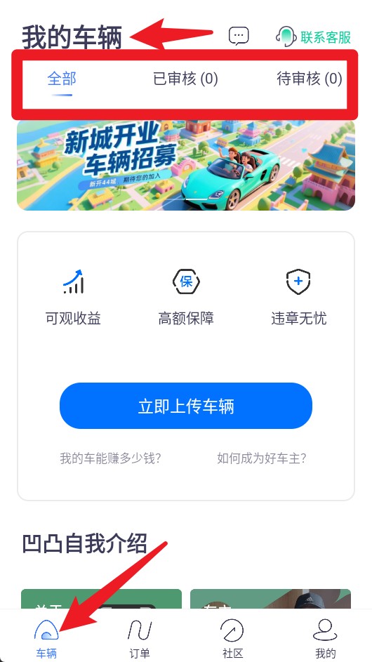 5、切换为车主模式后,进入车辆页可上传车辆信息,查看收益数据与审核进度管理。