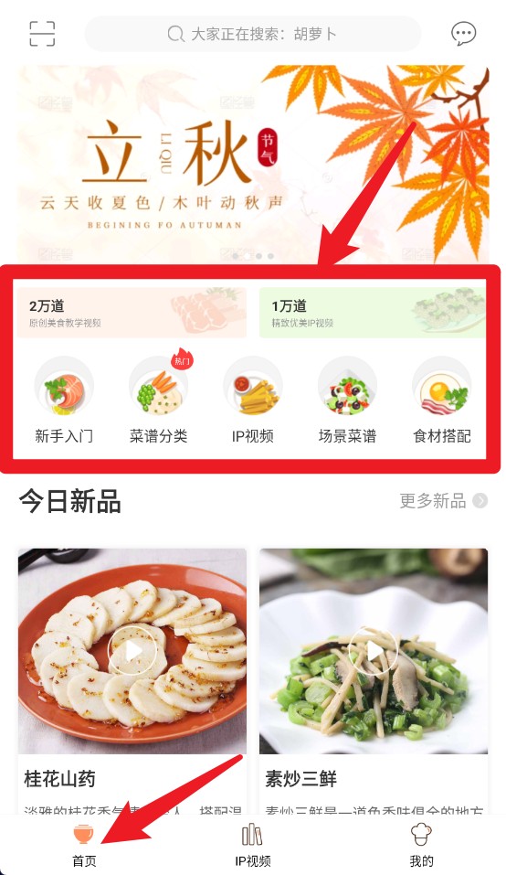 1、首页展示节气主题横幅,提供新手入门、菜谱分类、IP视频等功能入口,便于用户快速查找所需内容。